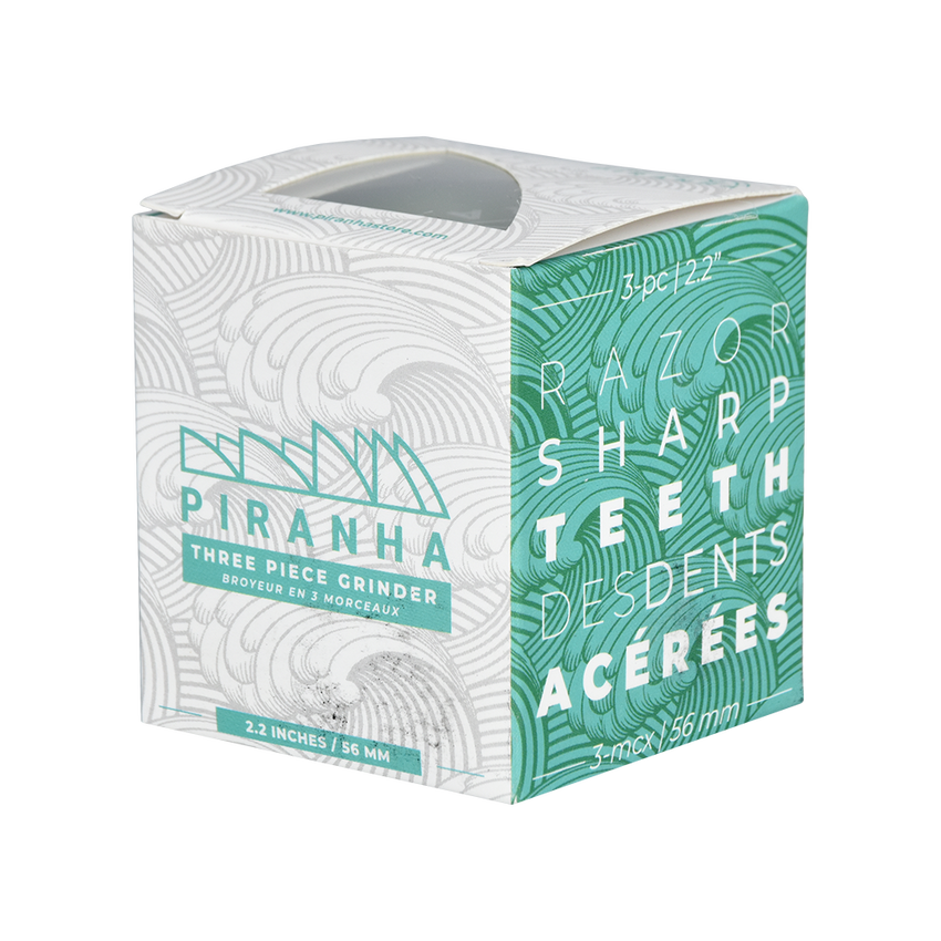 Make a splash with the Piranha Grind-and-Store Grinder. The razor-sharp teeth will chomp through dry herb for a smooth grind, while the roomy bottom chamber is perfect for saving the day's catch for later. These 3-count solid top grinders are forged from anodized aluminum, measure 2.2 inches (55mm) in diameter, and unlike a real piranha... they can never die!